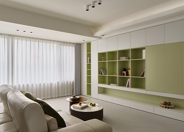 本案摒弃繁复堆砌,用极致白色打造干净利落的空间骨架,天花板、墙面与地面无缝衔接,延伸出无界的视觉通透感。浅绿作为空间的点睛之笔,以克制的比例融入细节:柜体的隐形把手泛着青绿微光,窗帘的纱质面料晕染着淡绿肌理,餐桌花艺的鲜绿枝叶轻摇生姿。白色承载生活的秩序,浅绿唤醒自然的灵性,两者碰撞出“少即是多”的高级感,让每一次归家都成为逃离喧嚣、拥抱宁静的治愈之旅。